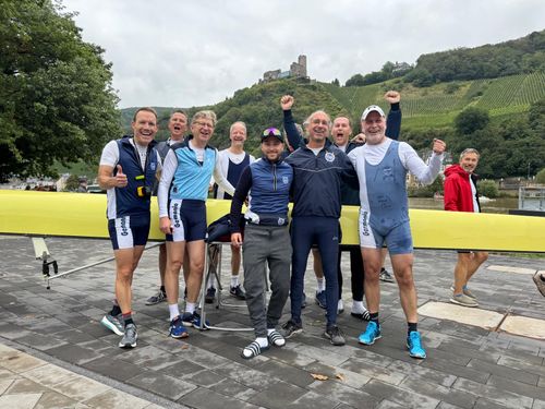 Das Masters-Team der FRG Germania war in diesem Jahr in drei Männer-Achtern mit Stm. (Masters Altersklassen D, E, und „Offen“ in verschiedenen Kombinationen), einem Frauen-Achter mit Stm., einem Männer-Zweier und einem Gig Vierer mit Stm. für den Grünen Moselpokal gemeldet. Die Stimmung unter den Sportlern und die Atmosphäre insgesamt waren hervorragend. Der anspruchsvolle Mosel-Kurs über 4,4 km mit einer Wende auf der halben Strecke zog auch in diesem Jahr internationales Publikum inklusive Weltmeistern und Olympiasiegern an. Und das spornt natürlich insbesondere unseren Steuermann und Coach Elias Aronovici zur Höchstform an, da er mit vollem Einsatz vier Boote an einem Tag erfolgreich über die Strecke geführt hat.